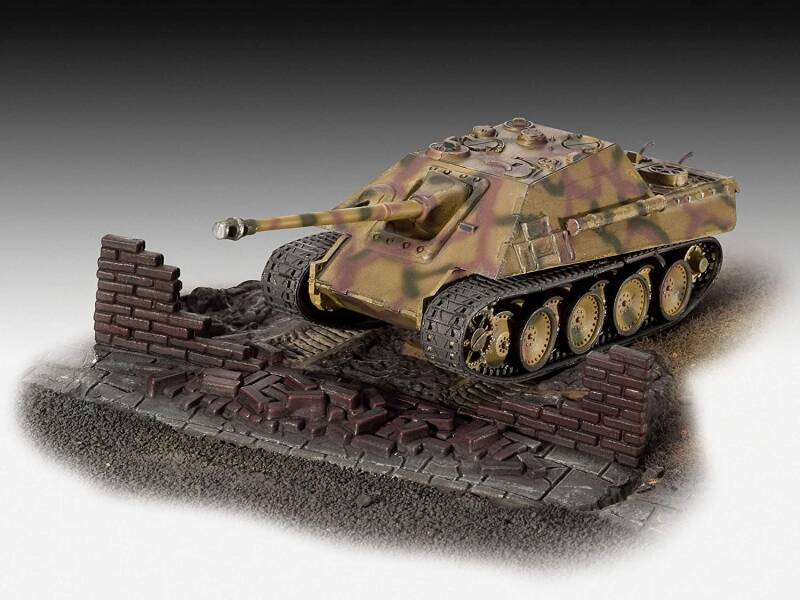 Afgeleid van de beroemde Panzerkampfwagen V Panther, bleek de Jagdpanther superieur aan elke geallieerde tegenstander in de strijd vanwege zijn succesvolle combinatie van mobiliteit, pantserbescherming en vuurkracht. De Jagdpanther met een 8,8 cm Pak 43/3 L/71 werd geproduceerd vanaf januari 1944. Voortstuwing: 600 pk V 12-cilinder Maybach benzinemotor, topsnelheid: 55 km/u. Bemanning: 5 man. Dioramabord met een replica van ruïnes. Flexibele baan van zacht plastic Authentieke weergave van de volgende versies: Zware Gepantserde Infanteriedivisie 654, 1° Company, Elzas, Frankrijk, 1944 Onbekende eenheid, westelijk front, Duitsland, lente 1945 Leveringsomvang: Set incl. bouwinstructies en sticker